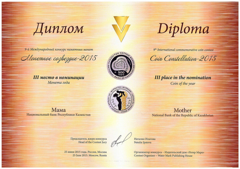 Kazakhstani coin «Mother » won 3rd place in «Coin of the Year» nomination. «Mother» is the first coin «from heart to heart» series which intends to express human values and make a message from people-to-people through the coins.