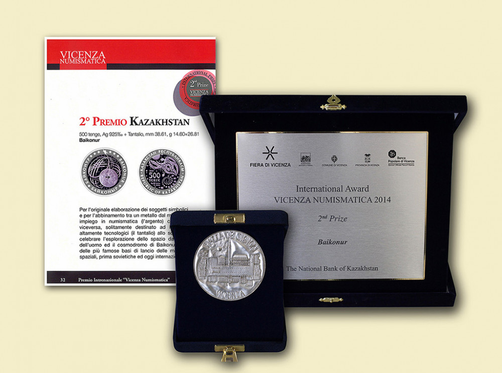 Such a high prize was awarded for original elaboration of symbolical objects and combination of silver and tantalum which are originally applied in hi-tech production. This coin reflects significant achievements in research of space and «Baikonur» spaceport, one of the most known launch space port in the world.