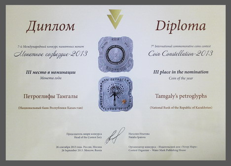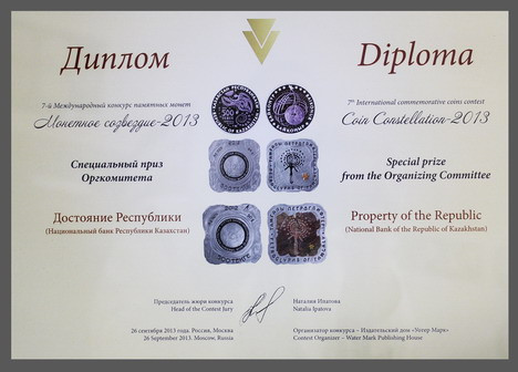 Organizing Committee presented to National Bank of Kazakhstan a special prize for coin series «Heritage of Kazakhstan». This series consists of four silver coins: “Issyk Chieftain”, “Baikonur” and two coins of “Petroglyphs of Tamgaly”.