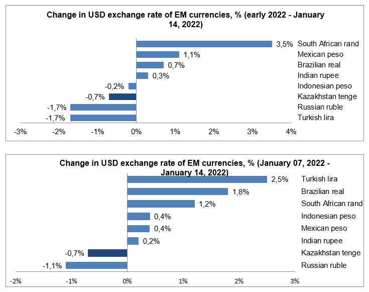 Following 14 January trading session, tenge market exchange rate made 434.84 KZT per US dollar having lost 0.7% since the beginning of the week (from 431.81). The bulk of the EM currencies appreciated for a week. On Wednesday, the US released a report on Consumer Price Index, where December parameter demonstrated a record high base inflation for nearly forty years. Against this background, DXY dropped to a two-month minimum, whereas revenues on treasury bonds demonstrated growth. Situation on the oil market reveals positive dynamics amid a limited supply and waning concerns about Omicron strain, oil prices exceeded USD 86 per barrel.
