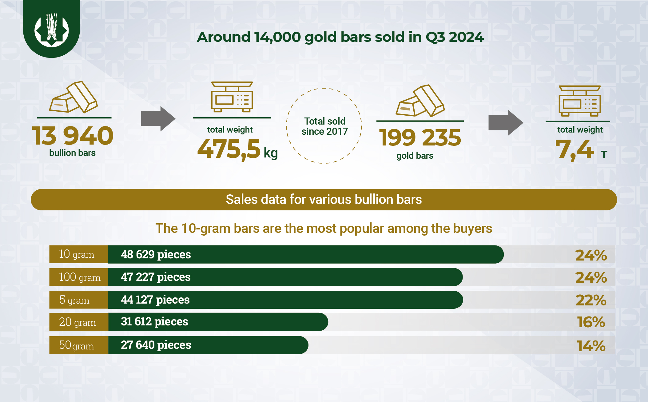 The Program for the Sale and Repurchase of Refined Gold Bars for Households (hereinafter the “Program”) was launched by the National Bank in 2017. A total of 199,235 gold bars weighing 7.4 tons have been sold since the start of the Program.