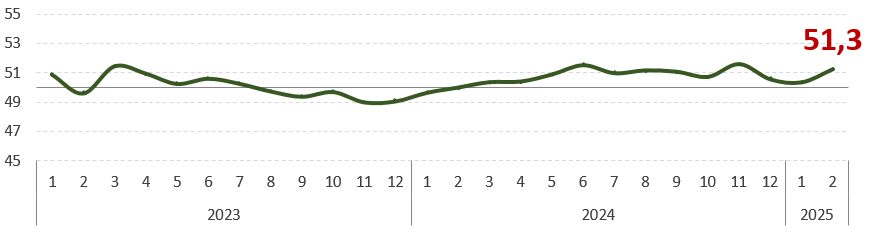 In February 2025, business activity improved and made 51.3. Increase in the business activity was reported in manufacture and services sector, where the index moved from negative to positive area, amounting to 54.0 and 50.6 respectively (49.9 and 49.7 respectively in January). In trade, business activity stayed put (51.6), and in construction, a slowdown to 50.3 is reported (from 51.0 in January). Thus, deterioration in business activity was recorded only in the mining industry, where the indicator remained in the decline zone and made 48.5 (49.8 in January).