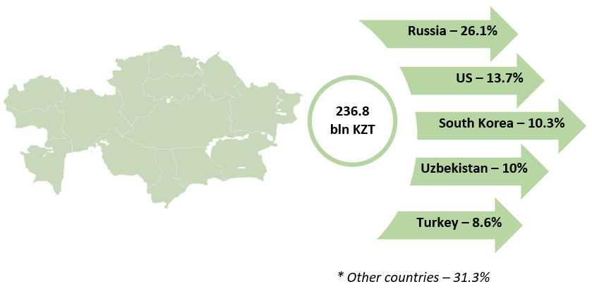 Volume of money transfers received from abroad totaled 236.8 billion KZT or 23% of the total volume of cross-border transfers carried out through the IMTS. Average amount of one transfer to Kazakhstan from abroad was 300.600 KZT.