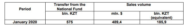 Due to the balance on the tenge account and the inflows to the National Fund in January 2020, to provide appropriate guaranteed transfers, the National Bank converted foreign exchange assets of the National Fund for a total amount of 489.4 million USD dollars (185.9 billion tenge).