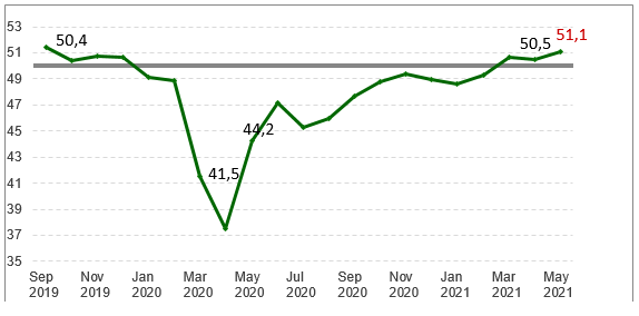 Obtained estimates demonstrate that business activity index in May inched up by 0.6 and made 51.1 (50.5 in April).