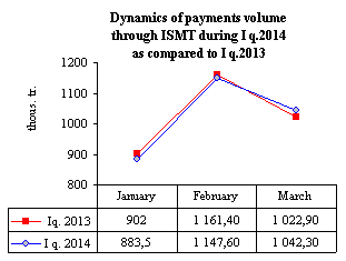 At that through ISMT, system-significant payment system of the country, during I quarter of 2014 97,6% of total value of non-cash payments in the country and 39,7% of their total quantity were processed, which gives evidence of fulfillment by ISMT of intended purpose in conducting the most large-size and high-priority payments.