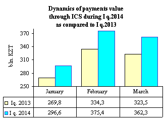 On the whole 7,7 mln. transactions to the amount of 43 230,2 bln. KZT (or 254,0 bln. US dollars) were conducted through payment systems of Kazakhstan (Interbank System of Money Transfer and Interbank Clearing System) in I quarter of 2014. As compared to I quarter of 2013 number of payments in payment systems decreased by 2,7% (by 212,9 thousand transactions), while increased amount of payments by 20,2% (by 7 265,1 bln. KZT).