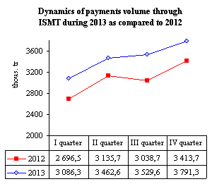 At that through ISMT, system-significant payment system of the country, during 2013 97.3% of total value of non-cash payments in the country and 39.4% of their total quantity were processed, which gives evidence of fulfillment by ISMT of intended purpose in conducting the most large-size and high-priority payments.