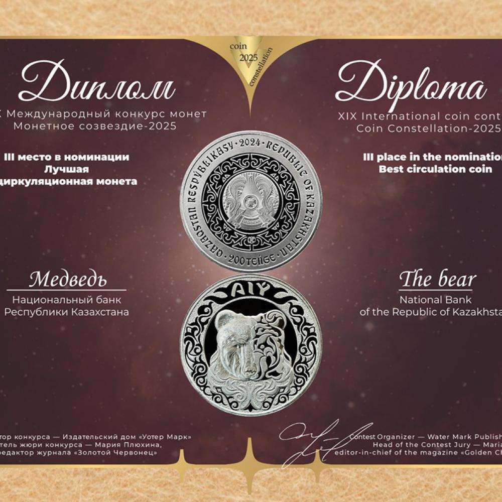 «Уотер Марк» баспасы ұйымдастырған «Монетное созвездие-2025» XIX Халықаралық монеталар конкурсында «AIY» («Аю») коллекциялық монетасы жүлделі үшінші орынға ие болды.