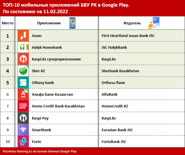 По данным Google Play, по состоянию на 11 февраля 2022 года первое место в рейтинге заняло приложение Jusan от Jusan Bank. Приложение включает в себя множество направлений, в том числе услуги как самого банка, так и дочерних организаций экосистемы Jusan, работающих в сфере страхования и на рынке ценных бумаг. Кроме того, приложение даёт доступ к маркетплейсу «Jusan Магазин», где можно приобрести в рассрочку товары и услуги, действуют бонусная система, доставка и многое другое.