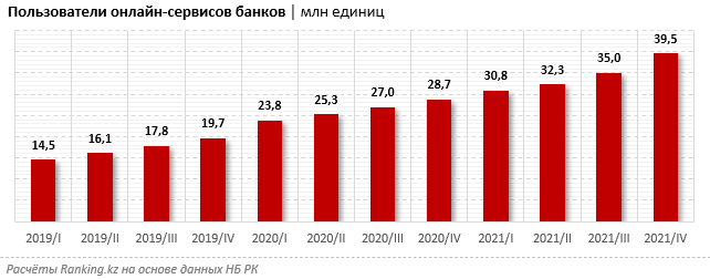 В Казахстане ожидаемо наблюдается тенденция роста использования онлайн–сервисов БВУ. Так, за два года количество пользователей увеличилось вдвое, составив к началу текущего года 39,5 млн (в 2020 году – 28,7 млн, в 2019–м – 19,7 млн).