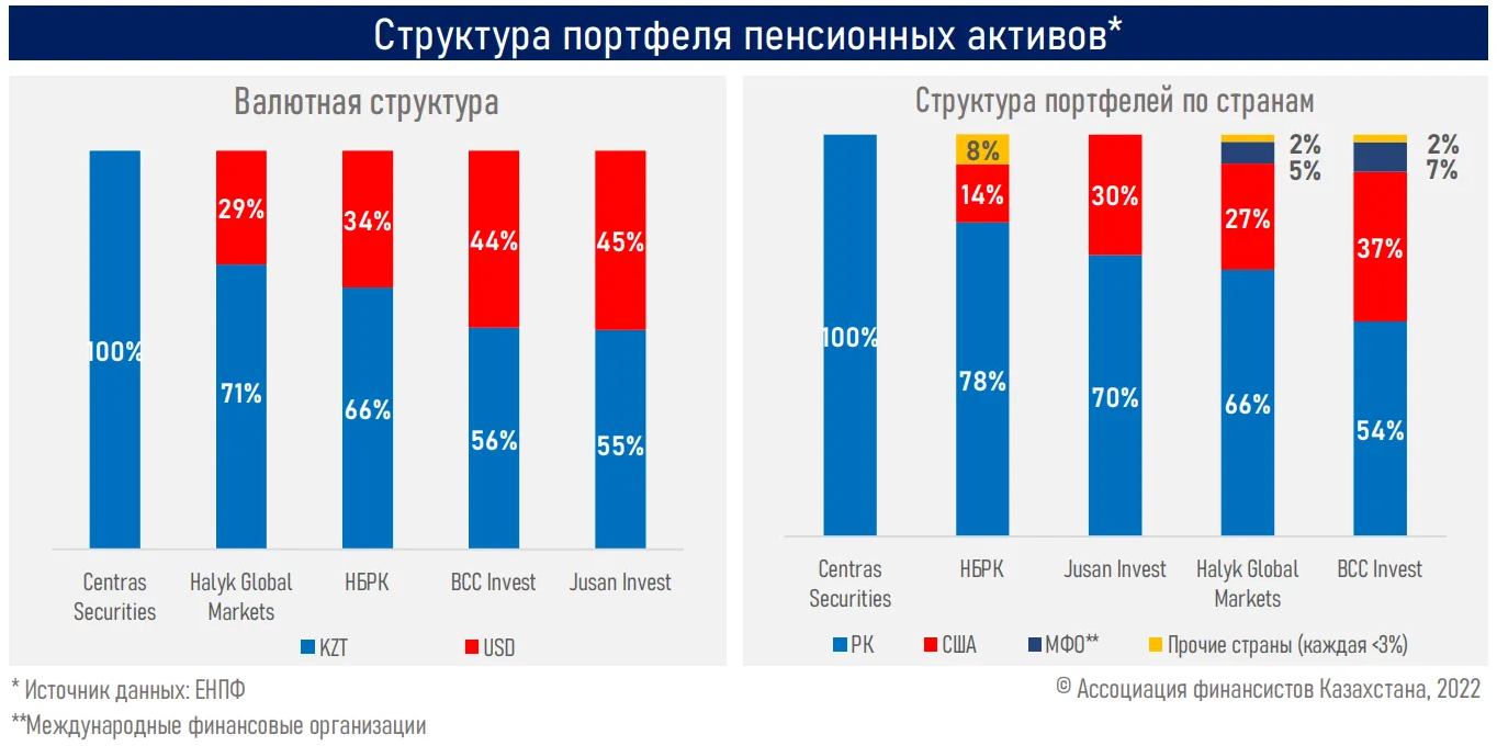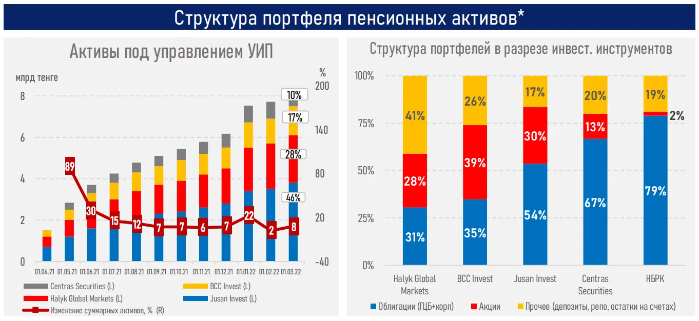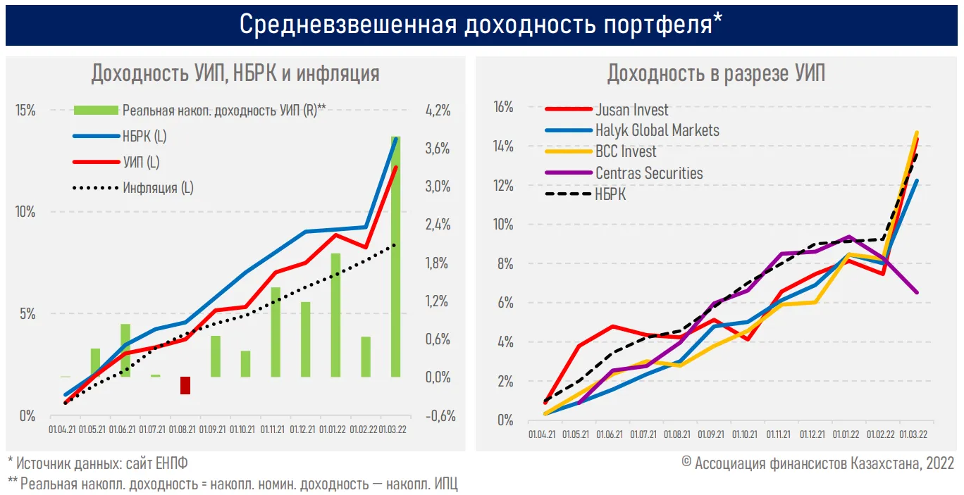 «Исходя из структуры портфеля, наличия большой доли ликвидных финансовых инструментов и надежных эмитентов, стратегию управления пенсионными активами под управлением УИП и НБРК можно охарактеризовать как консервативную. Это, в свою очередь, приводит к низкой доходности инвестиций. Тем не менее результаты инвестиционных стратегий, вопреки высокой волатильности на фондовых рынках, являются весьма успешными», – поясняют эксперты.