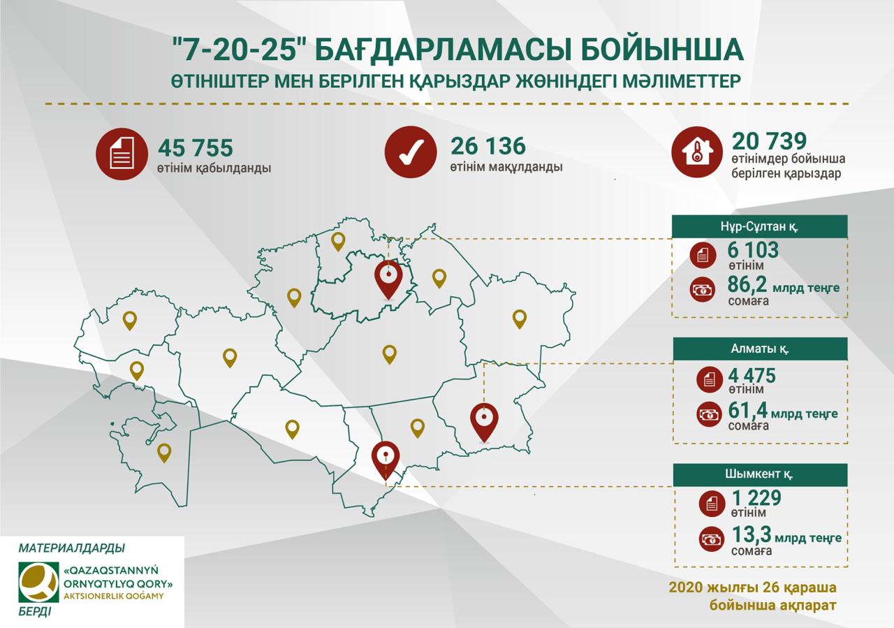 «7–20–25» бағдарламасын іске асыру аясында 2020 жылғы 26 қарашадағы жағдай бойынша қарыз алуға 534,5 млрд теңгеге 45 755 өтінім қабылданды. Оның ішінде 306,7 млрд теңге сомасында 26 136 қарыз берілді.