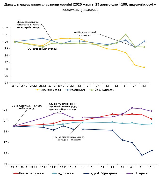 Сыртқы валюта нарығында 2021 жылғы 5 – 8 қаңтар аралығындағы кезеңде дамушы елдер валюталарының серпіні әртүрлі бағытта болды. Джорджия штатындағы сайлау нәтижелері бойынша демократтар АҚШ Сенатында көпшілік дауысқа ие болды. АҚШ президенті Д. Трамп елде Қытайдың 8 қосымшасын қолдану арқылы транзакциялар жүргізуге тыйым салатын жарлыққа қол қойды. АҚШ-тың қазіргі президентін жақтаушылар АҚШ Конгресінің ғимаратында тәртіпсіздіктер жасады.