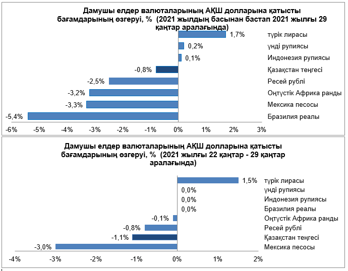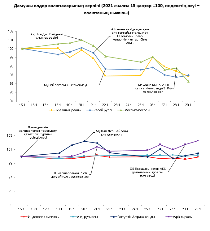 Сыртқы валюта нарығында 2021 жылғы 22–29 қаңтар аралығындағы кезеңде дамушы елдер валюталарының серпіні әртүрлі бағытта болды. АҚШ ФРЖ пайыздық мөлшерлемені 0–0,25% аралығында өзгеріссіз сақтап қалды, АҚШ экономикасының баяу қалпына келуін және ауқымды қолдау шараларынан бас тартуға дайын еместігін де атап өтті. АҚШ Конгресінің сенаторы наурыздың ортасына қарай жаңа ынталандыру топтамасының қабылдануын қамтамасыз етуге тырысатынын мәлімдеді. ДДҰ вирустың таралуын тоқтату үшін қажетті вакциналардың аз қамтылғаны туралы ескертті. ХВҚ әлемдік экономиканың өсу болжамын 5,5%-ға дейін арттырды (алдыңғы болжамда 5,2%). Қор индекстері жеке инвесторлардың әрекеттеріне және вакцинация болашағының белгісіздігіне байланысты қауіптену аясында төмендеді.