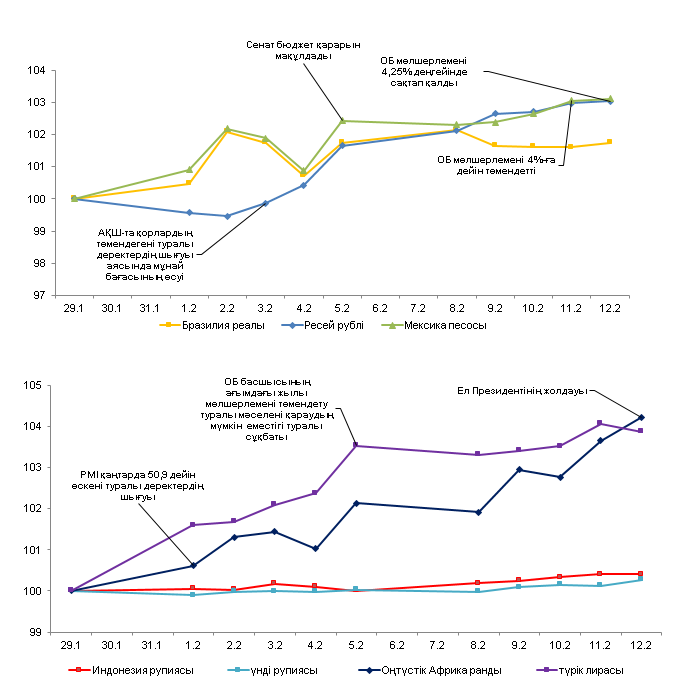 Сыртқы валюта нарығында 2021 жылғы 5 – 12 ақпан аралығындағы кезеңде дамушы елдер валюталарының серпіні АҚШ-та ынталандыру топтамасын қабылдау және коронавирусқа қарсы вакцинацияны қамтуды кеңейту жөніндегі күтулердің нәтижесінде оң болды. Ұлыбритания Үкіметі елде Covid-19-ды жұқтырудың қысқарғанына сенімді екенін білдірді, 14 миллионнан астам адам алғашқы екпені алды. АҚШ-та шектеу шаралары жеңілдету жоспарланған мерзімнен бұрын енгізілуде. Федералдық резервтік жүйенің Төрағасы Джером Пауэлл қалпына келтіруді қолдау үшін жеңілдетілген ақша-кредит саясаты мен қосымша қаржылық ынталандырудың қажет екенін тағы да мәлімдеді.
