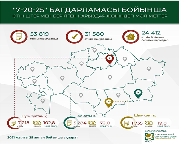 2021 жылғы 25 ақпандағы жағдай бойынша «7-20-25» бағдарламасын іске асыру аясында қарыз алуға 639,6 млрд теңгеге 53 819 өтінім қабылданды. Оның ішінде 377,4 млрд теңгеге 31 580 қарыз мақұлданды.