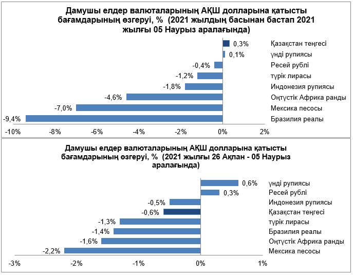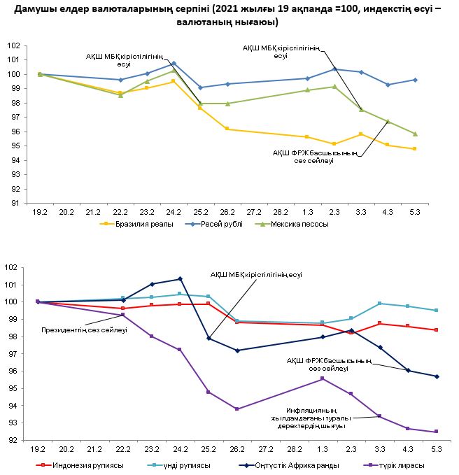 Сыртқы валюта нарығында 2021 жылғы 26 ақпан – 5 наурыз аралығындағы кезеңде дамушы елдер валюталарының көпшілігінің серпіні теріс болды.