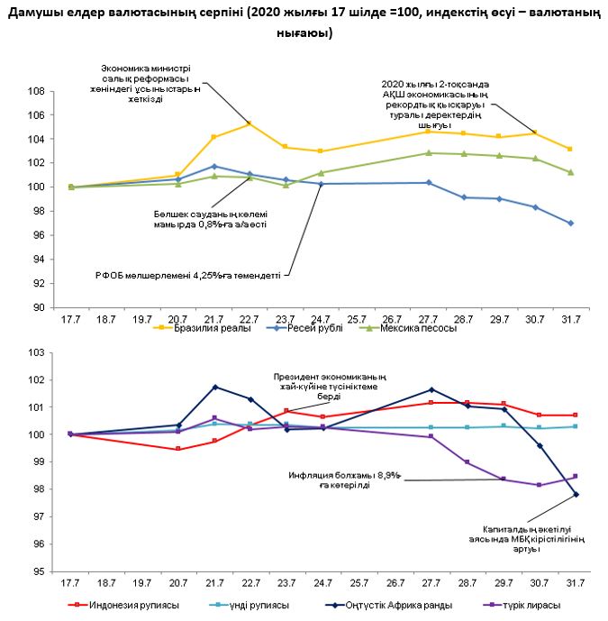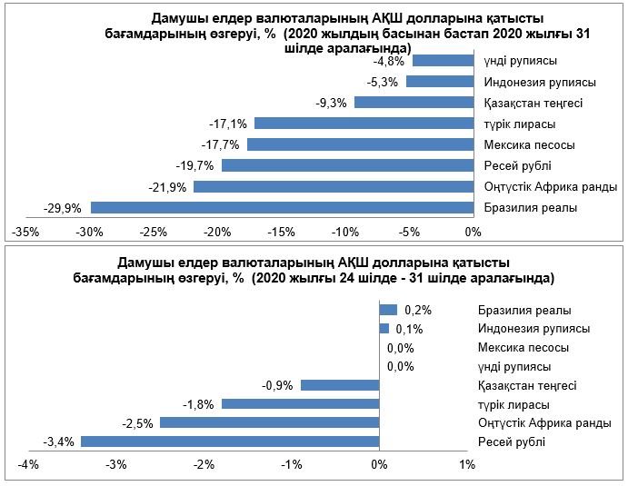 Сыртқы валюта нарығында 2020 жылғы 24 – 31 шілде аралығындағы кезеңде бірқатар маңызды оқиғалар орын алды. АҚШ ФРЖ пайыздық мөлшерлемені бұрынғы деңгейінде (0-0,25%) сақтап қалды, ФРЖ басшысы ОБ ынталандырушы саясатының ұзақ уақыт сақталатындығы және экономиканы қалпына келтіру үшін реттеушінің басқаруындағы барлық құралдардың пайдаланылатындығы туралы мәлімдеді. Апта ішінде әлсіз макроэкономикалық деректер мен Д. Трамптың президенттік сайлауды кейінге қалдыру ұсынысына байланысты саяси тәуекелдердің өсуі аясында АҚШ долларының жаһандық әлсіреуі байқалды. 2020 жылғы 2-тоқсанда көрсеткішті есептеу басталған кезден бастап АҚШ (-32,9% ж/ж) және Еуроаймақ (-15% ж/ж) экономикаларының аса қатты құлдырағаны көрінді.