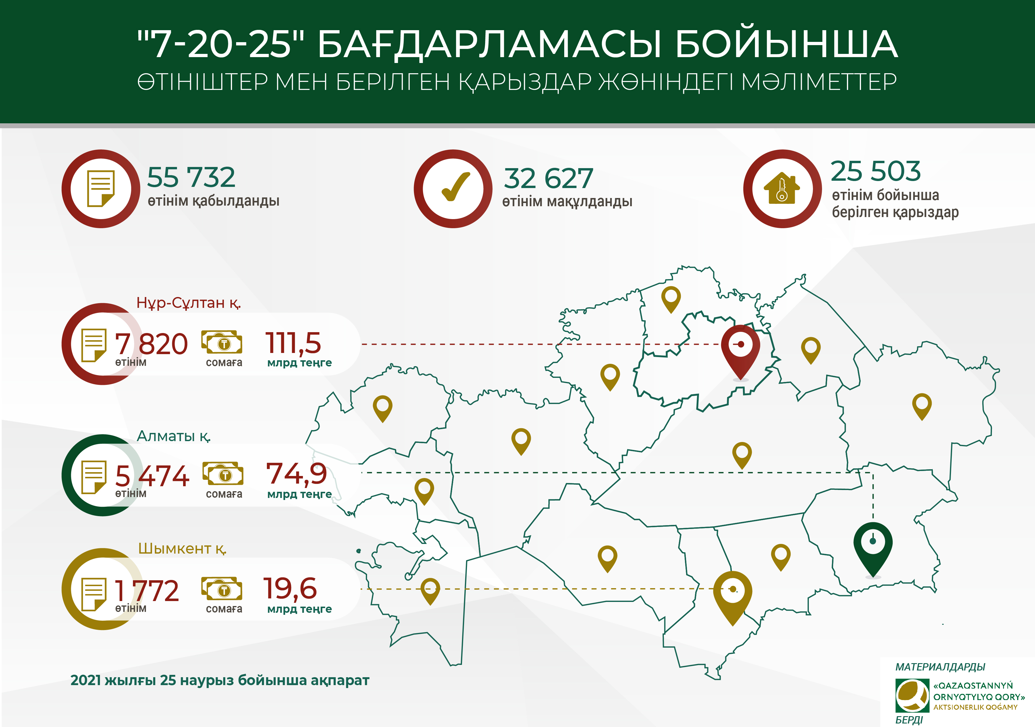 2021 жылғы 25 наурыздағы жағдай бойынша «7–20–25» бағдарламасын іске асыру аясында қарыз алуға 664,8 млрд теңгеге 55 732 өтінім қабылданды. Оның ішінде 391,2 млрд теңгеге 32 627 қарыз мақұлданды.