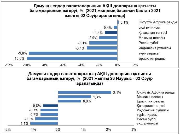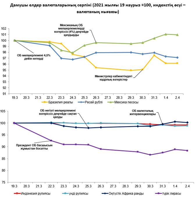 Сыртқы валюта нарығында 2021 жылғы 26 наурыз – 2 сәуір аралығындағы кезеңде дамушы елдер валюталарының серпіні әртүрлі бағытта болды. АҚШ президенті Джо Байден $2,25 трлн сомасына АҚШ-тың инфрақұрылымдық жоспарын ұсынды. Тәуекелді активтер ҚХР бірнеше IT-компанияларының ірі пакеттерін нарықта сатуына байланысты құбылмалылықты көрсетті. ҚХР-дағы өңдеу өнеркәсібіндегі іскерлік белсенділік индексі 2020 жылғы қарашадан бері ең жоғары деңгейге көтеріліп, (ақпандағы 50,6-дан) 51,9-ға дейін өсті. Наурызда АҚШ-та жұмыс орындарының саны 916 мыңға ұлғайды (соңғы 7 айдағы ең жоғары көрсеткіш), жұмыссыздық деңгейі 6%-ға дейін төмендеді.