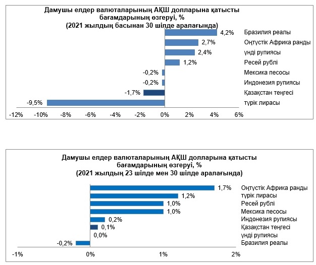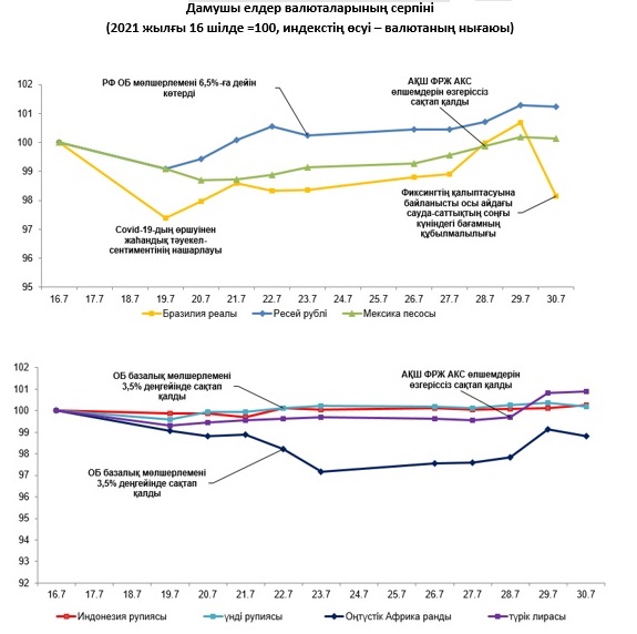 Сыртқы валюта нарығында 2021 жылдың 23-30 шілде аралығындағы кезеңінде дамушы елдер валюталарының серпіні әртүрлі бағытта болды. Апта басында алыпсатарлық пен ҚХР-ға инвестиция салуға қатысты АҚШ инвесторларына реттеушілік шектеу туралы қауіп аясында Қытай акциялары мен юань бағамы күрт төмендегендіктен дамушы нарықтардың валюталарына қысым жасалды, бірақ кейін АҚШ ФРЖ Төрағасының экономиканы қолдау үшін барлық құралдарды пайдалануға дайын екендігі туралы түсініктемесінен соң теріс пікір жойылды. АҚШ ФРЖ ақша-кредит саясатының өлшемдерін өзгеріссіз (базалық мөлшерлеме 0-0,25% аралығында) сақтай отырып, активтерді сатып алу бағдарламасын қысқарту үшін қойылатын талаптарды орындаудағы ілгерілеуді атап өтті, бұл ретте осындай қысқарту мерзімдері туралы шешім әлі қабылданған жоқ. АҚШ ІЖӨ 2021 жылдың 2-тоқсанында 6,5%-ға ж/ж өсті, бұл экономистердің болжамынан да асып түсті.
