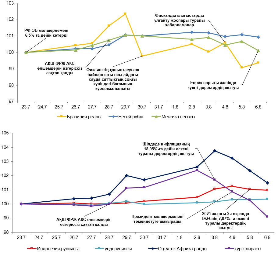Сыртқы валюта нарығында 2021 жылдың 30 шілде - 6 тамыз аралығындағы кезеңінде дамушы елдер валюталарының серпіні әртүрлі бағытта болды. АҚШ ФРЖ Төрағасының орынбасары Ричард Кларида мөлшерлемені көтеретін талаптардың 2022 жылға қарай жасалатыны жөнінде түсіндірді. Бұдан басқа, шілдеде АҚШ-та еңбек нарығы жөніндегі нақты деректердің шығуы (ауыл шаруашылығына жатпайтын сектордағы жұмыс орындарының саны 943 мыңға өсті – 11 айдағы ең жоғары мәні, жұмыссыздық 5,4%-ға дейін төмендеді) АҚШ ФРЖ-сын қатаңдатудың тезірек басталуын күтуді күшейтті.