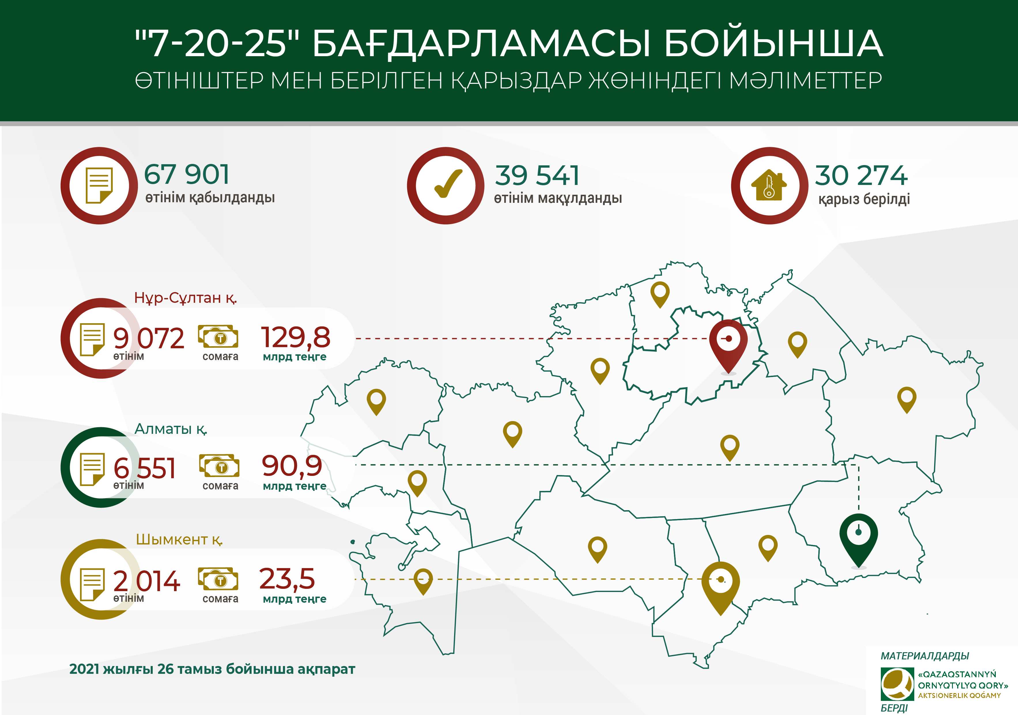 2021 жылғы 26 тамыздағы жағдай бойынша, «7-20-25» бағдарламасын іске асыру аясында 832,2 млрд теңге несие алуға 67 901 өтініш қабылданды. Оның ішінде 485,7 млрд теңгеге 39 541 несие мақұлданды.