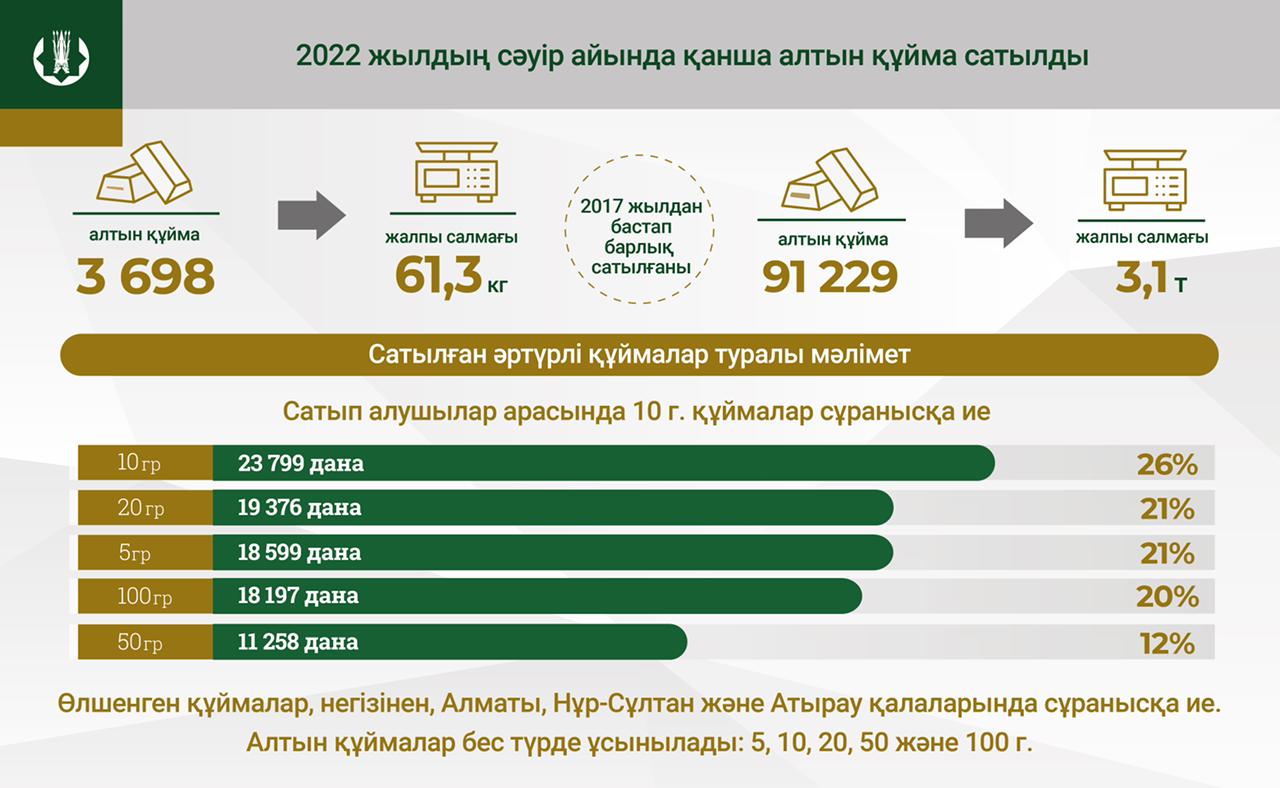 Алтын құймалар бес түрлі салмақта ұсынылады: 5, 10, 20, 50 және 100 г. Сатып алушылар арасында өте жоғары сұранысқа ие түрі – 10 грамдық алтын құйма. Жалпы сатылған құймалар арасында оның үлесі – 26%, яғни, 23 799 дана. Одан кейін 20 грамдық құйма сұранысқа ие, 19 376 дана (21%), 5 грамдық құймадан 18 599 дана (21%), 100 грамдық құймадан 18 197 дана (20%), 50 грамдық құймадан 11 258 дана (12%) сатылды. Алтын құймалар Алматы, Нұр-Сұлтан және Атырау қалаларында көп сатылады.