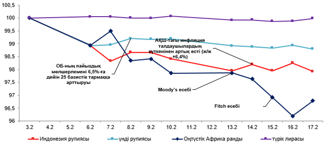 2023 жылдың 10-17 ақпан аралығында сыртқы валюта нарығында бірқатар маңызды оқиға болды. Қаңтарда АҚШ-тағы инфляция ж/ж 6,4%-ға дейін бәсеңдеді, бірақ талдаушылар күткеннен асып түсті. Қаңтарда АҚШ-тағы бөлшек сауда 2021 жылғы наурыздан бастап ең жоғары қарқынмен а/а 3%-ға өсті. Жыл басында өндірушілердің бағасы күткенге қарағанда 0,7%-ға көбірек өсті. АҚШ-тағы күшті макроэкономикалық деректер АҚШ ФРЖ-ның мөлшерлемелерді жоғары деңгейде ұзақ уақыт ұстап тұру ықтималдылығын арттырды. Бұл факторлар көбінесе дамушы нарықтарда валюталардың теріс динамикасын құрды.