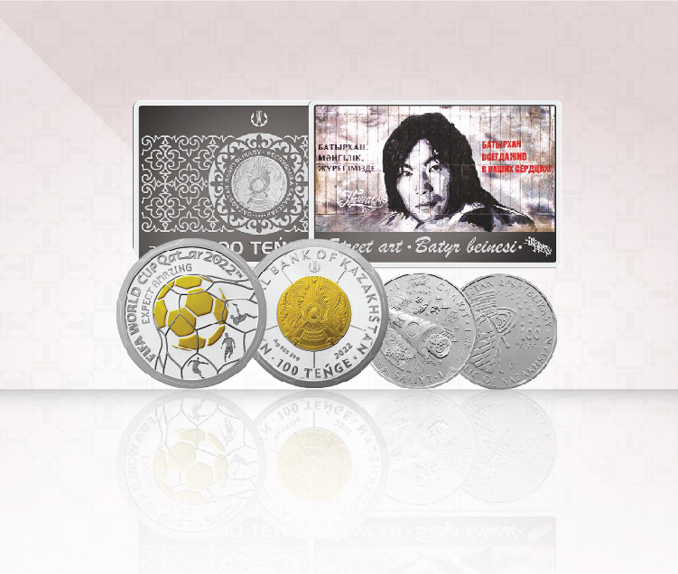 «Спорт» монеталар сериясымен шыққан FIFA WORLD CUP QATAR 2022 коллекциялық монеталарында алтын жалату технологиясы қолданылған. 925/1000 сынамасы бар күміс монеталардың массасы 20 грамм, диаметрі 37 мм, дайындау сапасы – proof, номиналы 100 теңгелік, Қазақстанның ішкі нарығына арналған саны – 3 650 дана.