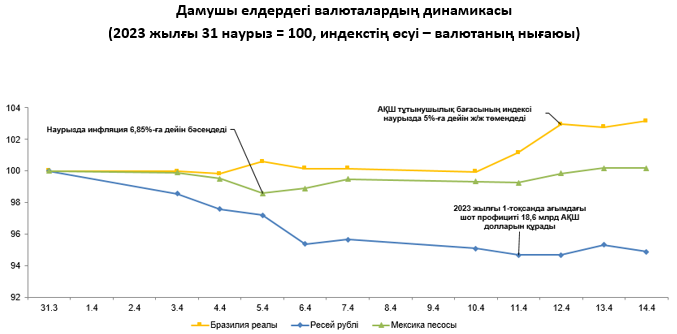 2023 жылғы 7-14 сәуір аралығында сыртқы валюта нарығында бірқатар маңызды оқиға болды. Еңбек статистикасы бюросының деректері бойынша, АҚШ-та тұтыну бағаларының индексі жылдық мәнде ақпандағы 6%-дан наурызда 5%-ға дейін төмендеді. АҚШ-тағы өндірушілер бағасының индексі (PPI) ақпандағы ж/ж 4,9%-дан наурызда ж/ж 2,7%-ға дейін құлдырады. АҚШ-та жұмыссыздық бойынша жәрдемақы алуға берілген алғашқы өтініштер саны 239 000-ға дейін өсті. Статистикалық деректердің шығуы аясында инвесторлар арасында ФРЖ мөлшерлемелерін арттыру циклі жақын арада аяқталар деген үмітпен сарыла күтті. Осыған байланысты АҚШ доллары жаһандық деңгейде әлсірей түсті. ФРЖ басқарушы кеңесінің мүшесі Кристофер Уоллер жұма күні инфляцияға қатысты тиісті мақсатқа қол жеткізу ісінде ФРЖ-ның айтарлықтай табысқа жете алмағанын мәлімдеді. Сөйте тұра, белгілі бір уақыт аралығында ақша-кредит саясаты нарық күткеннен де ұзақ уақыт бойы қатаң қалпында қалуға тиіс екенін атап айтты.