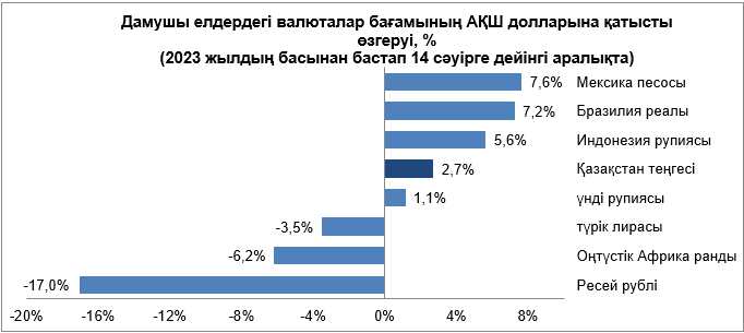 Жоғарыда аталған факторлар көп жағдайда дамушы нарықтарда валюталардың әртүрлі бағыттағы динамикасын көрсетті. Дамушы елдерде АҚШ долларына қатысты валюталар бағамының[1] динамикасы төмендегідей қалыптасты.