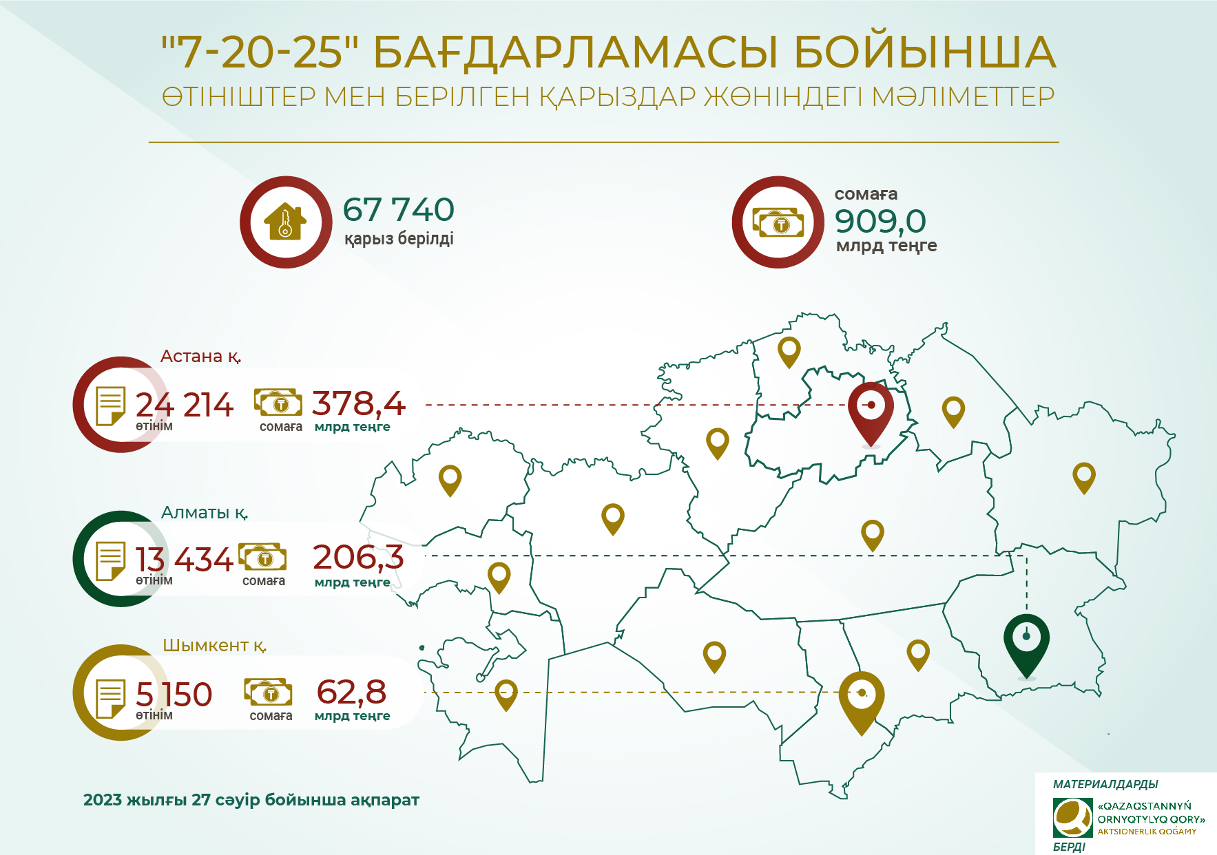 2023 жылғы 27 сәуірдегі жағдай бойынша, «7-20-25» бағдарламасын іске асыру аясында 909,0 млрд теңгеге 67 740 қарыз берілді.
