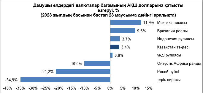 Жоғарыда аталған факторлар негізінен дамушы нарықтарда валюталардың теріс динамикасын көрсетті. Дамушы елдерде АҚШ долларына қатысты валюталар бағамының[1] динамикасы төмендегідей қалыптасты: