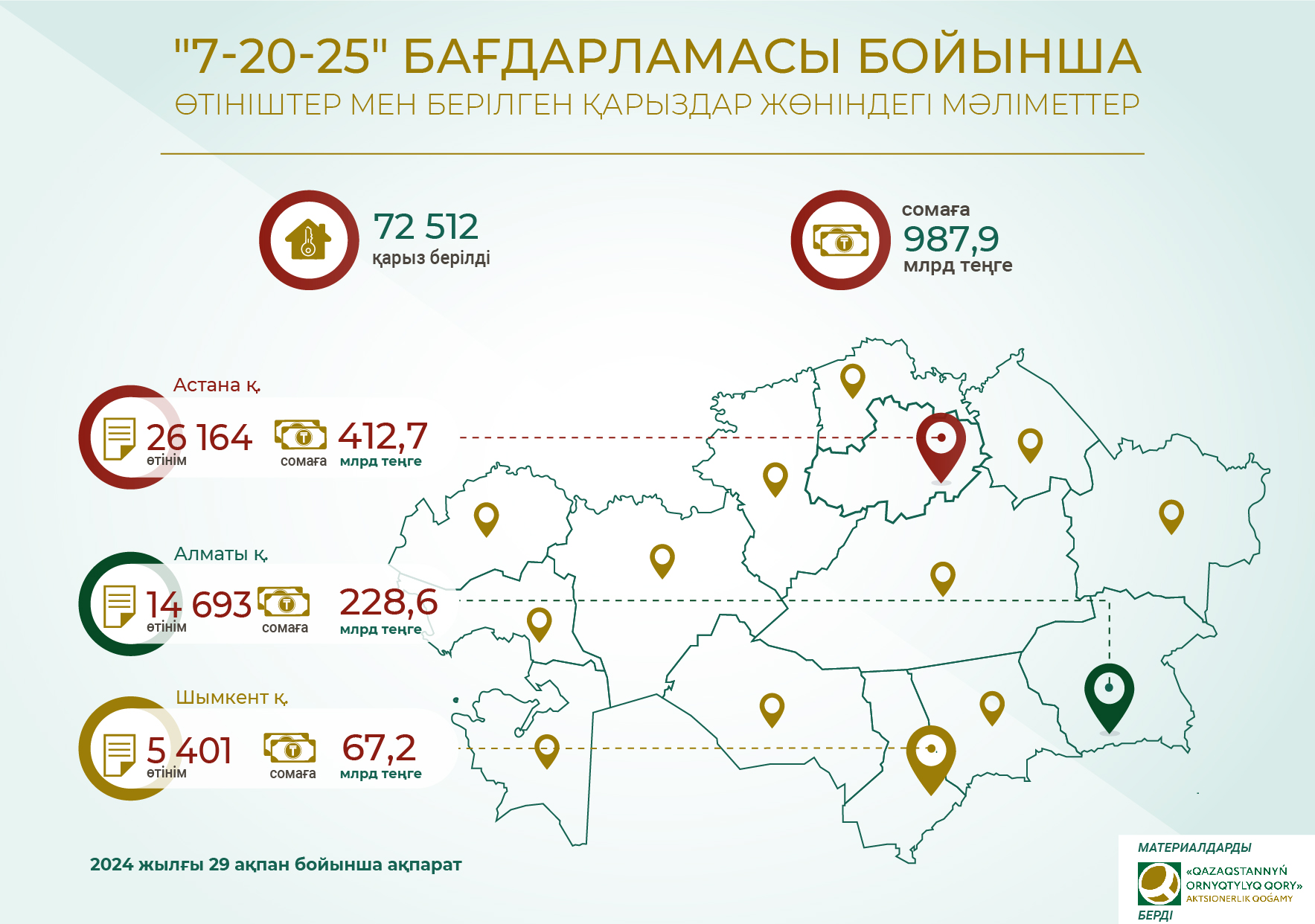 2024 жылғы 29 ақпандағы жағдай бойынша, «7-20-25» бағдарламасын іске асыру аясында 987, 9 млрд теңгеге 72 512 қарыз берілді.