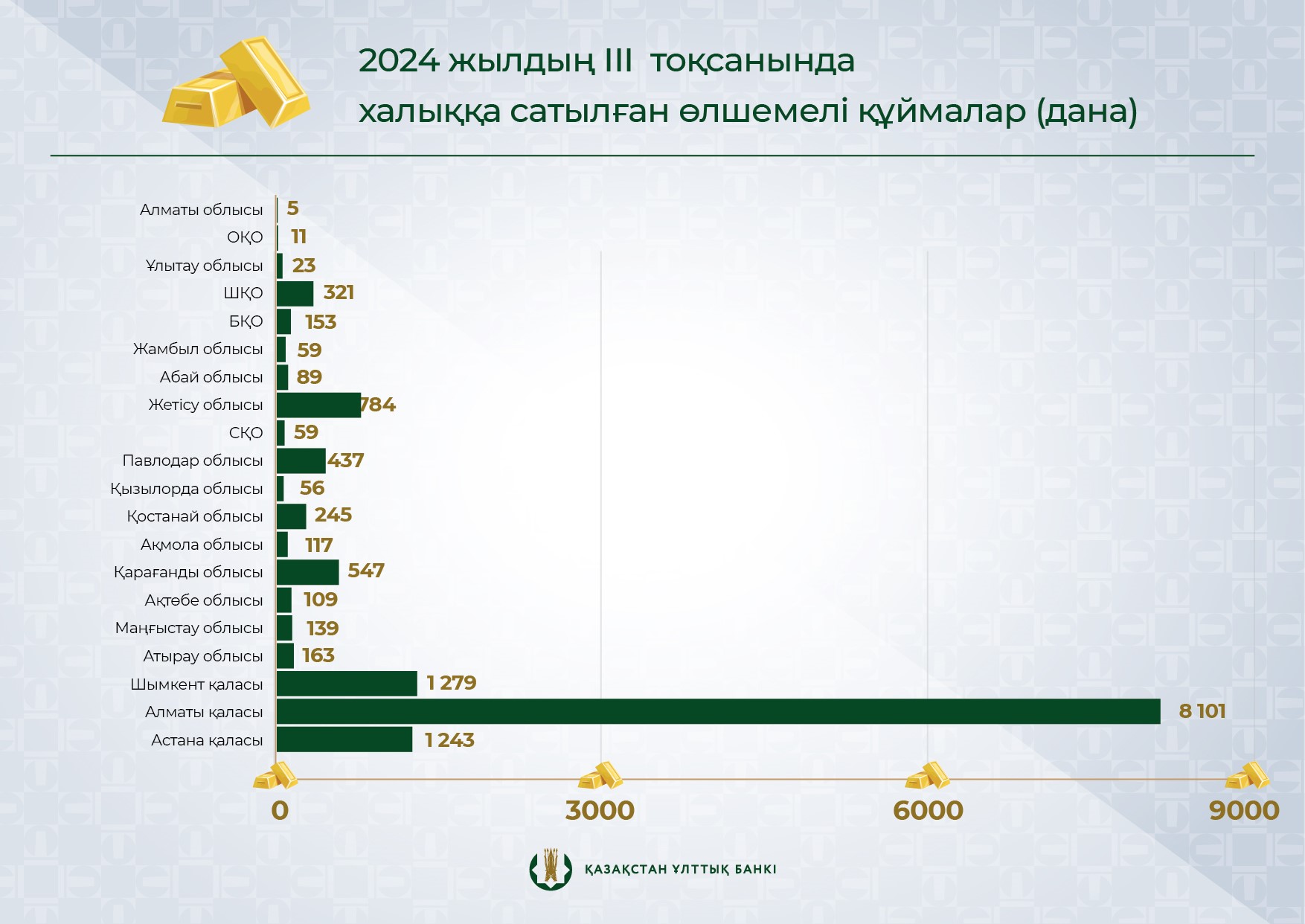2024 жылғы III тоқсанда алтын құймалардың ең көп бөлігі мына өңірлерде сатылды: Алматыда (8 101 дана, 58%), Шымкентте (1 279 дана, 9%) және Астанада (1 243 дана, 9%).
