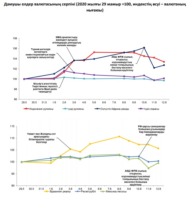 Сыртқы валюта нарығында 2020 жылғы 5 – 12 маусым аралығындағы кезеңде бірқатар маңызды оқиғалар орын алды. Дамушы елдердің валюталары АҚШ-та карантин шараларын жеңілдеткеннен кейін коронавирус инфекциясының екінші толқынының басталу қаупі (елдегі анықталған жұқтыру жағдайлары 2 млн астам болды), сондай-ақ 2020 жылғы АҚШ ФРЖ-сының экономика (-6,5%) және жұмыссыздық деңгейі (9,3%) бойынша жағымсыз болжамдар аясында төмендеді. АҚШ ФРЖ жоспарлы отырыс өткізді, оның қорытындысы бойынша мөлшерлеме деңгейін өзгертпестен, 0%-0,25% аралығында сақтауға шешім қабылданды. Джером Пауэлл АҚШ ФРЖ-сының 2022 жылдың соңына дейін мөлшерлемені ағымдағы деңгейде ұстап тұруға дайын екендігін хабарлады. Дүниежүзілік Банк жартыжылдық есебінде әлемдік экономиканың пандемия салдарынан Екінші дүниежүілік соғыс уақытынан бері ең жоғары мөлшерге (-5,2%) құлдырайтынын болжайды.