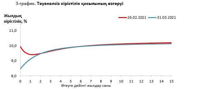 2021 жылғы наурыздың соңында кірістілік қисығы3 нарықтық мөлшерлемелер бойынша МБҚ сатып алуға нарықтың белсенді қатысуы аясында қалыпқа келгендігін көрсетті. Қысқа мерзімді қағаздар бойынша кірістілік есепті кезеңнің басымен салыстырғанда төмендеді.