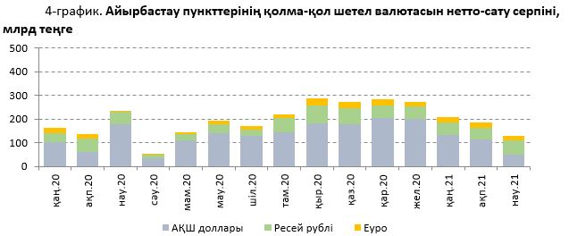2021 жылғы наурызда халық нетто-негізде 131,6 млрд теңгеге баламалы сомаға қолма-қол шетел валютасын сатып алды. Өткен аймен салыстырғанда бұл шығыс 28,8%-ға төмендеп (2021 жылғы ақпанда – 184,9 млрд теңге), 2020 жылдың ұқсас кезеңімен салыстырғанда (236,4 млрд теңге) нетто-сатып алу көлемі 44,3%-ға қысқарды. Шығыстың негізгі көлемі Ресей рублін – 43,5% немесе 57,3 млрд теңге, АҚШ долларын – 39,4% немесе 51,8 млрд теңге, еуроны – 16,9% немесе 22,2 млрд теңге сатып алуға бағытталды. Валюталардың түрлері бойынша бөлгенде АҚШ долларын сатып алуға жұмсалатын шығыс бір айда 2,2 есе (3,4 есе қысқару ж/ж) қысқарды, ал Ресей рублін сатып алуға жұмсалатын шығыс 20,6%-ға (5,1%-ға өсу ж/ж), еуроны сатып алуға жұмсалатын шығыс 3,8%-ға (6,0 есе өсу ж/ж) ұлғайды.