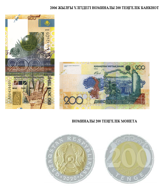 ҚҰБ номиналы 200 теңгелік банкноттардың заңды төлем құралы болып қалатынын еске салады. Олар 200 теңгелік монеталармен айналымда қатар жүреді. Ол банкноттарды төлемдердің, банктік операциялар мен аударымдардың барлық түрі бойынша қабылдауға міндетті.