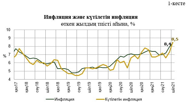 Шілде айында жүргізілген сауалнаманың қорытындысы бойынша, азық-түлік өнімдерінің жекелеген түрлерінің күрт қымбаттауы, жанар-жағармай мен құрылыс материалдары бағасының өсуі, халық үшін кейбір ақылы қызметтердің қымбаттауы аясында инфляциялық күтулердің артуы байқалады. Эпидемиологиялық жағдайдың нашарлауы мен карантиндік шектеулердің қайта қатаюы инфляциялық күтулердің артуына да ықпал етті. 2021 жылдың шілде айында бір жыл алға инфляциялық күтулердің сандық бағасы 8,5%-ды құрады (1-кесте)