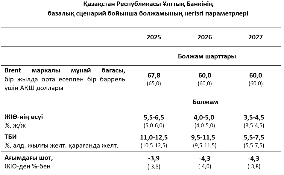 2025 жылға инфляцияның болжамы нақтыланды. Ортамерзімді кезеңде болжамды бағалау өзгерген жоқ. 2025 жылы инфляция – 11-12,5%, 2026 жылы – 9,5-11,5%, 2027 жылы – 5,5-7,5% шегінде күтіледі. Болжам жекелеген азық-түлік нарықтарында бағаның күрт өсуіне, сұраныс жағынан инфляциялық қысымның күшеюіне байланысты нақтыланды. Ұстамды қатаң ақша-кредит саясаты және жоспарланған фискалдық шоғырландыру шаралары инфляцияға тежеуші әсер ететін болады. Болжам тәуекелдері фискалдық тәртіпті сақтауға, ішкі сұраныстың күшеюіне, сыртқы инфляцияның жеделдеуіне, инфляциялық күтулердің тұрақтамауына, сондай-ақ реттелетін бағалар мен ҚҚС көтерілуінің жанама әсеріне байланысты.