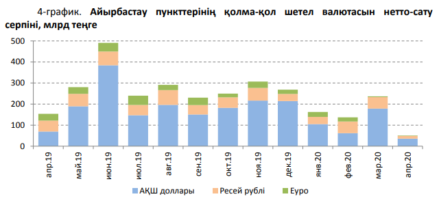 2020 жылғы сәуірде халық нетто-негізде 51,0 млрд теңгеге барабар сомаға (2020 жылғы наурызда – 236,4 млрд теңге) қолма-қол шетел валютасын сатып алды. Шығыстардың негізгі көлемі АҚШ долларын – 70,3% немесе 35,9 млрд теңгеге, Ресей рублін – 25,7% немесе 13,1 млрд теңгеге, еуроны – 3,9% немесе 2,0 млрд теңгеге сатып алуға жұмсалды. Өткен аймен салыстырғанда аталған шығыстар 4,6 есе қысқарды. Валюта түрлері бойынша бөлген кезде АҚШ долларын сатып алуға шығыстар 5 есе қысқарса, Ресей рублін және еуроны сатып алуға шығыстар тиісінше 4,2 есе және 1,9% азайды.