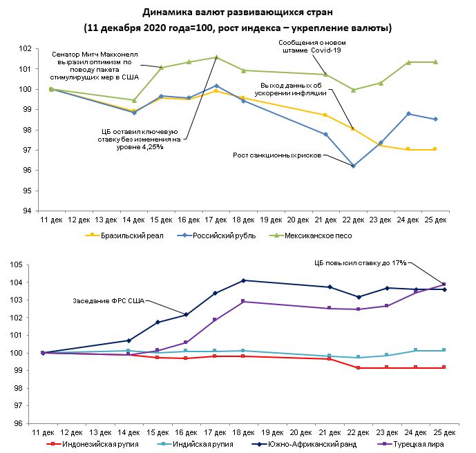 На внешнем валютном рынке в период с 18 по 25 декабря 2020 года благоприятная динамика на рынке валют развивающихся стран была прервана опасениями по поводу появления нового штамма коронавируса и перспектив одобрения пакета стимулов в США. Некоторые страны заявили об ограничении или прекращении транспортного сообщения с Великобританией на фоне динамики распространения вируса. Ранее Сенат США согласовал крупный пакет расходов по стимулированию экономики, однако Д.Трамп потребовал изменить законопроект в части увеличения выплат гражданам в рамках антикризисной программы. Великобритания заключила историческую торговую сделку с ЕС, договоренности завершают четырехлетний период согласования условий Брекзит. Министерство торговли США опубликовало список более 100 компаний РФ и КНР, потенциально связанных с вооруженными силами этих стран. Включение в список может ограничить приобретение некоторых товаров и технологий США данными организациями.