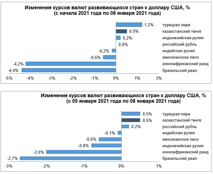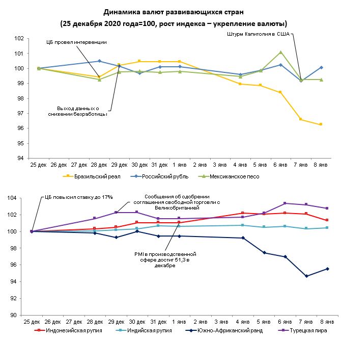 На внешнем валютном рынке в период с 5 по 8 января 2021 года динамика валют развивающихся стран была разнонаправленной. Демократы получили большинство в Сенате США по результатам выборов в штате Джорджия. Президент США Д.Трамп подписал указ, запрещающий проведение транзакций в стране с использованием 8 китайских приложений. Сторонники действующего президента США устроили беспорядки в здании Конгресса США.