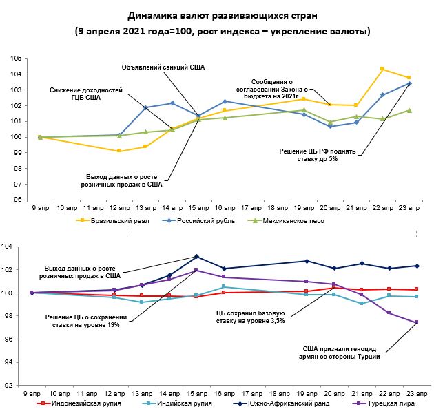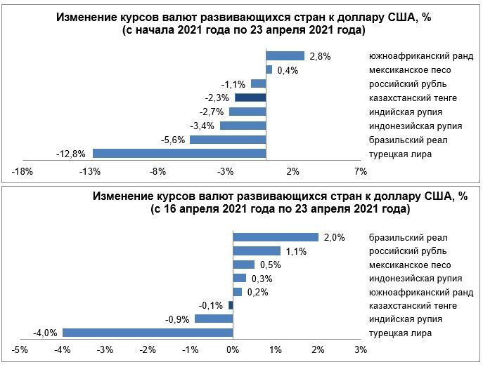 На внешнем валютном рынке в период с 16 по 23 апреля 2021 года динамика валют развивающихся стран была разнонаправленной. Доходности казначейских облигаций США снизились на фоне предложения Президента США Д.Байдена повысить налог на прирост капитала почти вдвое. Наблюдается новый всплеск заражений Covid-19 в мире (в Индии, Аргентине, Турции, Бразилии). ЕЦБ сохранил денежно-кредитную политику без изменений, просигнализировав о преждевременности обсуждений сворачивания масштабной программы экстренной скупки активов.