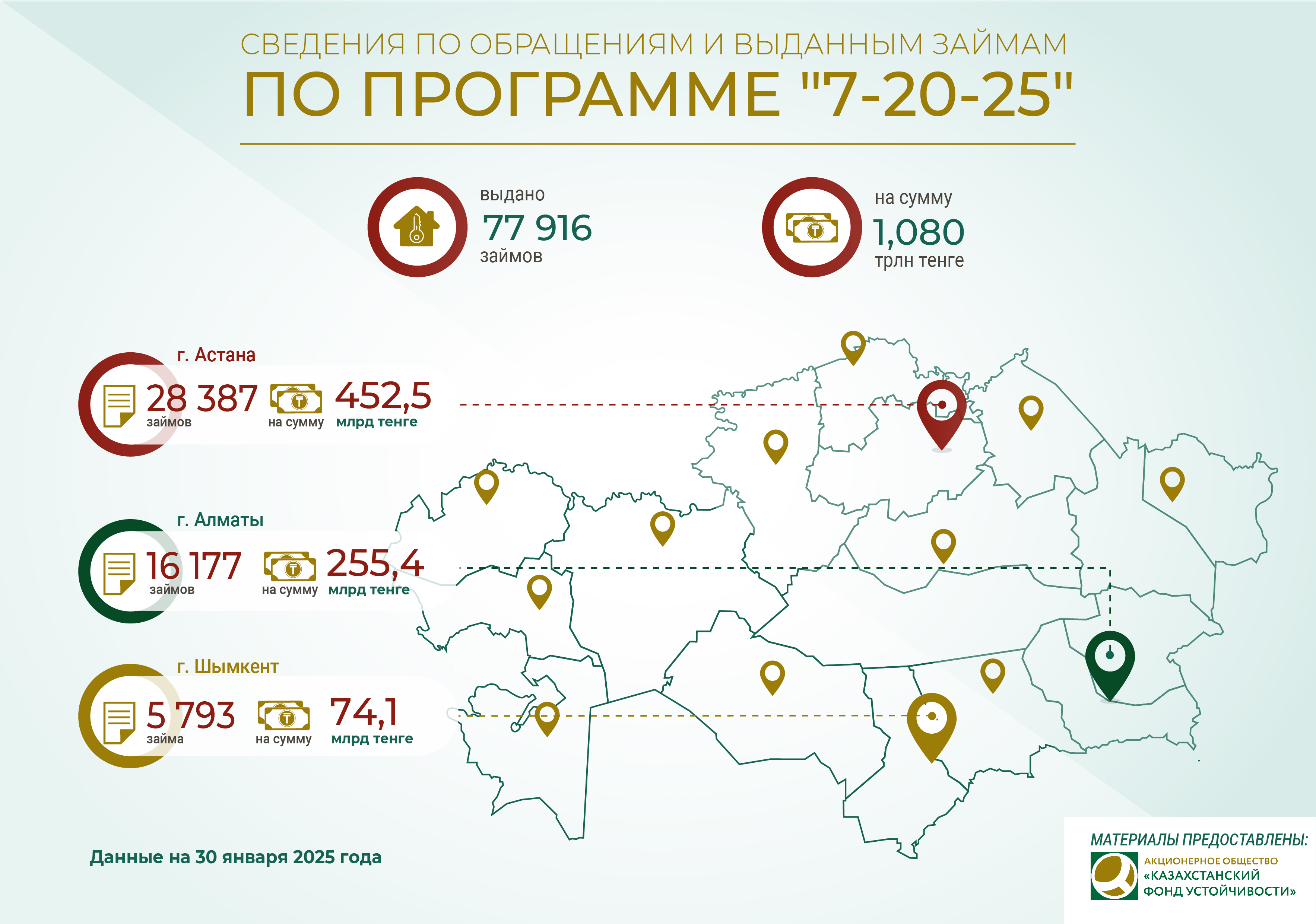 В рамках реализации программы «7-20-25» по состоянию на 30 января 2025 года выдано 77 916 займов на сумму 1,080 трлн тенге.