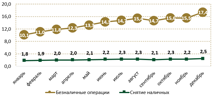Положительная тенденция в росте безналичных операций населения сохраняется. По итогам 2024 года, рост количества безналичных операций составил 13,4% (общее количество – 12,8 млрд операций), объема - 17% (общий объем – 166,1 трлн тенге). Так, в 2024 году в среднем населением ежедневно проводилось 35,1 млн безналичных операций на сумму 453,6 млрд тенге.