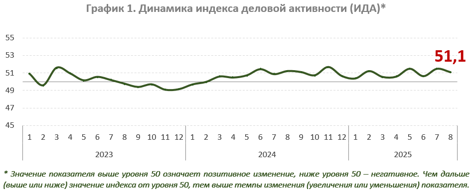 В августе 2025 года деловая активность замедлилась, составив 51,1 (51,5 в июле). Индикатор находится в позитивной зоне с марта 2024 года.